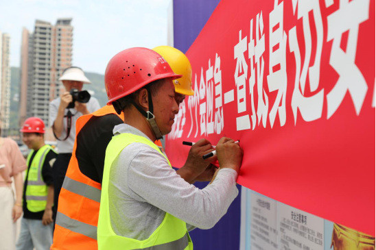 啟動儀式上,公司黨總支副書記、總經(jīng)理馮皓代表業(yè)主單位致辭,宣布安全生產月活動正式啟動。馮皓強調安全生產對項目建設的重要性,要求全體人員將安全理念貫穿工作始終,積極參與各項安全活動。并特別指出,張家河生態(tài)修復項目承載著改善區(qū)域生態(tài)環(huán)境、造福一方百姓的重要使命。作為項目業(yè)主,深知安全生產不僅是項目順利推進的基石、守護建設者生命安全的防線,更是踐行社會責任、保障生態(tài)修復事業(yè)高質量發(fā)展的核心要義。隨后,施工單位代表領誓,宣讀了《安全生產誓詞》。緊接著,參與人員在“安全生產月”主題橫幅上簽名,以莊重的形式明確自身安全責任。